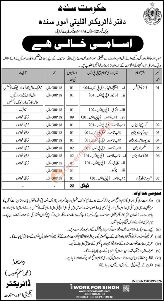 The Directorate of Minority Affairs, Government of Sindh, has announced a recruitment drive for 22 support and administrative positions across multiple divisions of Sindh, including Karachi, Hyderabad, Mirpurkhas, Sukkur, Larkana, and Shaheed Benazirabad. This opportunity is open to qualified and hardworking individuals seeking stable, permanent employment in the public sector under the Sindh Government’s civil service framework.