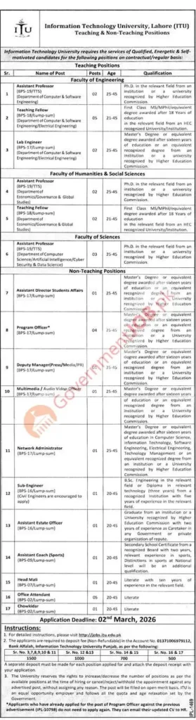 Information Technology University (ITU) Lahore Jobs 2026 – Faculty & Administrative Roles (BPS-19 to BPS-02)