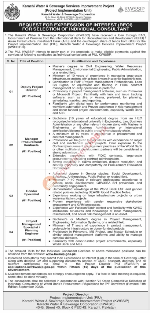 The Karachi Water & Sewerage Corporation (KW&SC), through its Project Implementation Unit (PIU) for the Karachi Water & Sewerage Services Improvement Project (KWSSIP-II), has announced a strategic recruitment drive for four high-impact individual consultant positions. Funded by the World Bank (IBRD) and the Asian Infrastructure Investment Bank (AIIB), this $300+ million initiative aims to modernize Karachi’s aging water supply and sewerage infrastructure—serving over 16 million residents with reliable, equitable, and sustainable services.