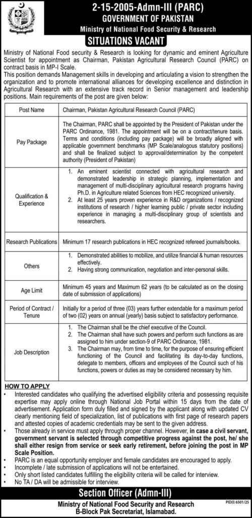 The Government of Pakistan, through the Ministry of National Food Security & Research, has announced a prestigious leadership opportunity for an eminent agricultural scientist to serve as Chairman of the Pakistan Agricultural Research Council (PARC). This is a top-tier, federal-level appointment on a 3-year contract (extendable up to 5 years) under the MP-I Scale, reporting directly to the President of Pakistan under the PARC Ordinance, 1981.
