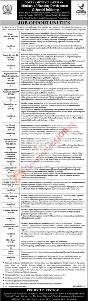 The Ministry of Planning, Development & Special Initiatives, Government of Pakistan, has announced a dynamic recruitment drive for 25+ contract-based positions under the Social Sector Accelerator for Health, Nutrition, Education, Youth & Gender (HNEYG)—a flagship initiative within the Prime Minister’s Youth Empowerment Programme. Based in Islamabad, these roles span senior leadership (PPS-8), mid-level management (PPS-7), and essential support staff (PPS-6/PPS-2), offering professionals the chance to shape national social development policy with real-world impact.