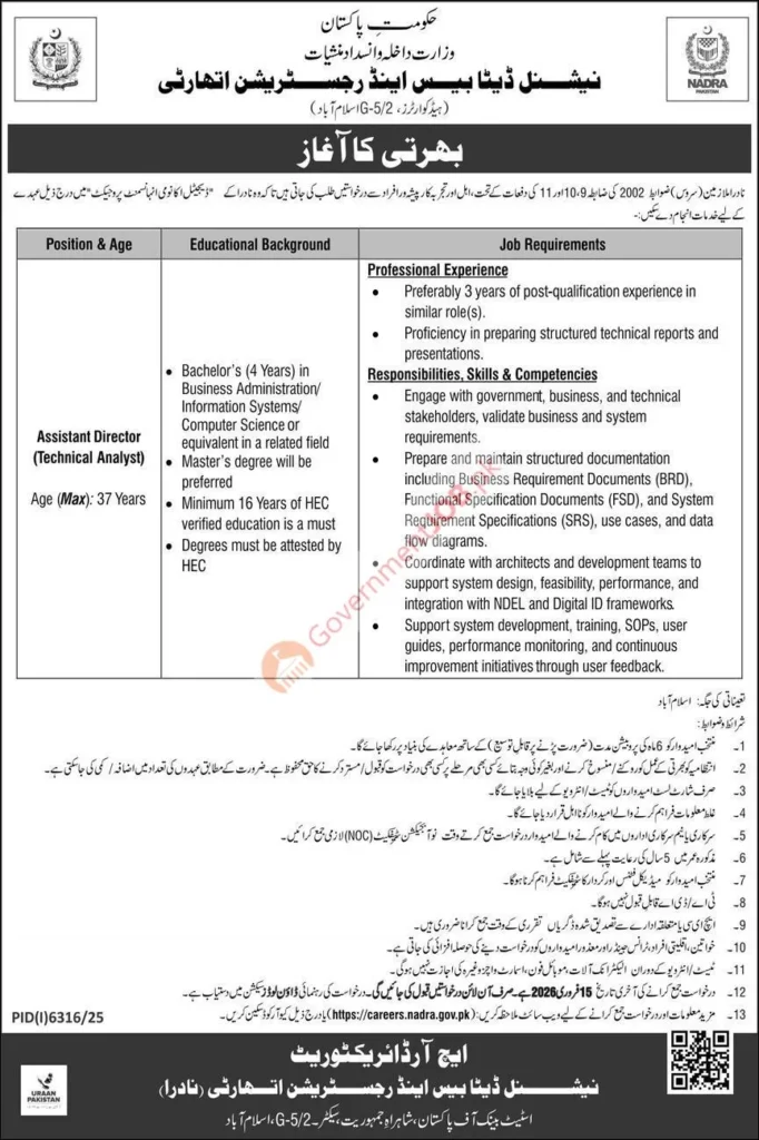 NADRA Assistant Director Jobs 2026 – Tech & Analytics Roles in Islamabad (5-Year Contract)