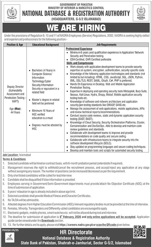 Note: This job posting is based on the advertisement published in The News on January 26, 2026. The final authority for selection, interpretation, and appointment rests with the National Database & Registration Authority (NADRA) and the Federal Government of Pakistan. NADRA reserves the right to cancel, modify, or re-advertise the post without prior notice.