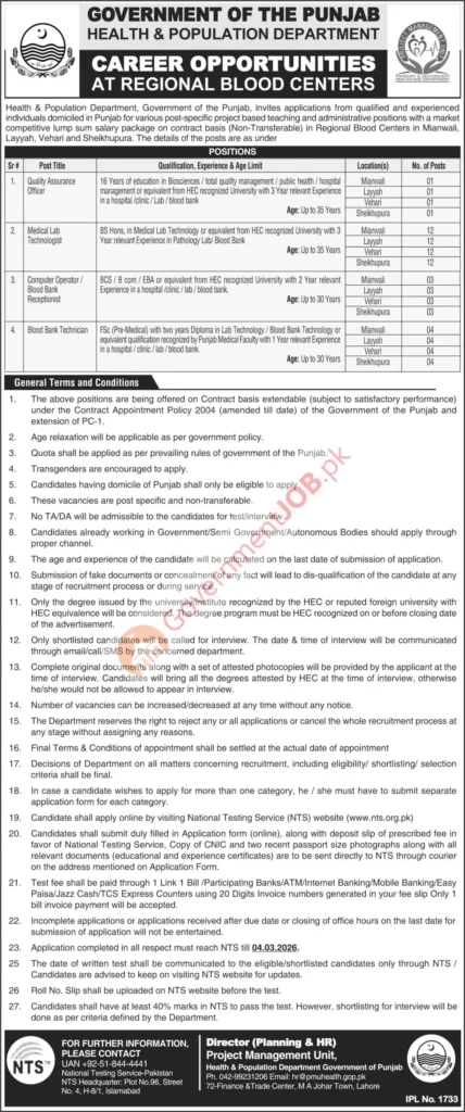 🔗 Apply Now via NTS Portal (Search “Punjab Health Department Regional Blood Centers 2026”)