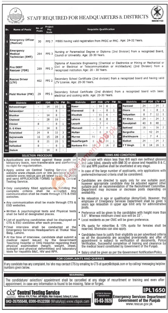 Visit www.ctspak.com and locate the “Rescue 1122 Punjab Jobs 2026” listing. Complete the online form with accurate details regarding personal information, educational history, license numbers (for drivers), and district preference.
